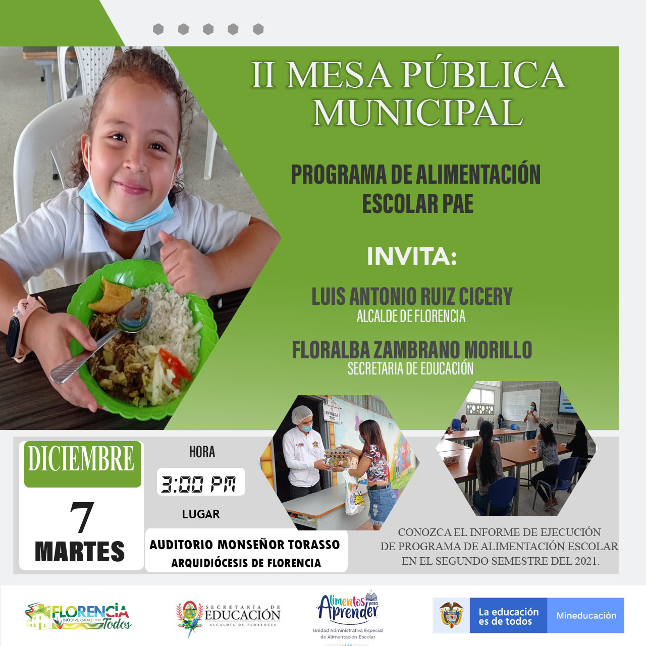 La Mesa Pública fue precedida por el Alcalde de Florencia Luis Antonio Ruiz Cicery, la Secretaria de Educación Floralba Zambrano Morillo y su equipo de trabajo de Cobertura Educativa; contó con la asistencia de delegados de las comunidades educativas del municipio, los Entes de control y público en general.  Como aspectos a resaltar de la Mesa está el reconocimiento a la calidad del servicio y a los alimentos entregados en el Programa y el seguimiento a la ejecución del mismo. De otra parte, se aclararon inquietudes y se recibieron sugerencias a tener en cuenta para la ejecución del Programa en el 2022.