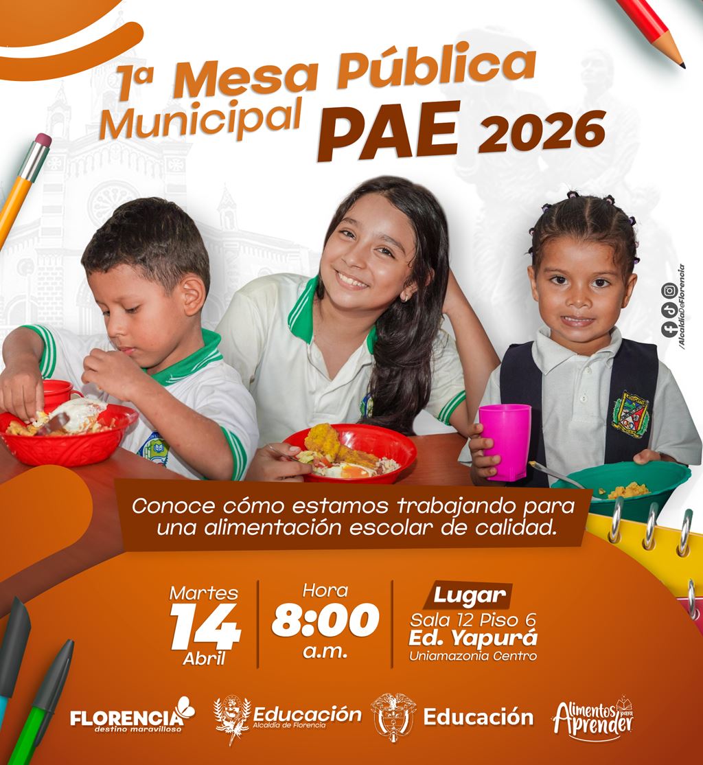 La Secretaría de Educación de Florencia, en articulación con la Alcaldía de Florencia, invita a los diferentes actores del Programa de Alimentación Escolar (PAE) a participar en la 1ª Mesa Pública Municipal del PAE 2026.